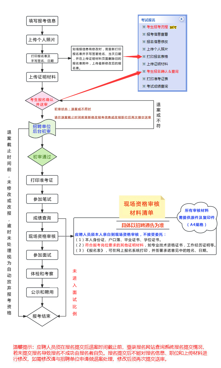 7、所有操作都必须在退案时间截止前进行修改或完善,截止后所有操作将被锁定,无法进行再次操作,请考生仔细阅读报考流程。 |